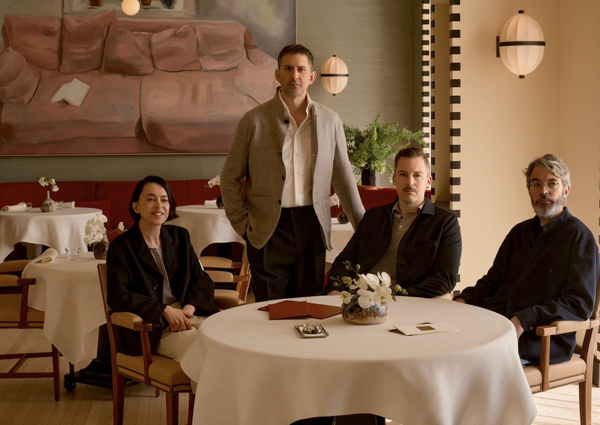 Titelbild: Matsalen med Adam Dahlberg, Albin Wessman samt arkitekterna Christian och Ruxandra Halleröd.